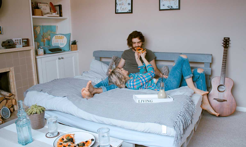 Netflix and chill isn't just for single people. Find shows you both have an interest in and binge away. Use the opportunity to take a break from adulting. Is it dinner time? No problem. Microwave a meal and eat it in bed while devouring your favorite show.